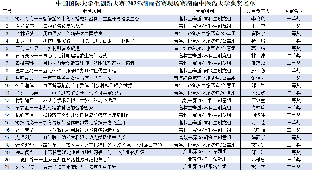 从无到有,从有到优,从优到尖。亮眼成绩单的背后,是我校锚定新医科建设方向,持续深耕创新创业教育,构建“课程教学-实践训练-项目孵化”三位一体育人体系的生动实践。此次获奖项目广泛覆盖中医药传承创新、健康医疗技术、人工智能应用、乡村振兴等多个前沿领域,充分展现了我校多学科交叉融合、协同创新的办学特色。